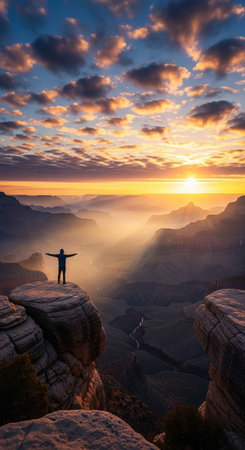 A person stands on a cliff edge with arms outstretched during a breathtaking sunset