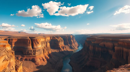 Toroweap point at sunrise, Grand Canyon National Park. Panoramic View Of Grand Canyon Against Sky. Amazing pano view of the Grand Canyon from the south rim. The convoluted gorge formed over millions of years by the Colorado River, erosion, and gravity. AI generated illustration