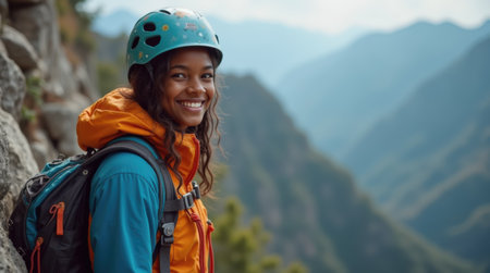 Portrait of a smiling female climber looking at camera while standing on a cliff