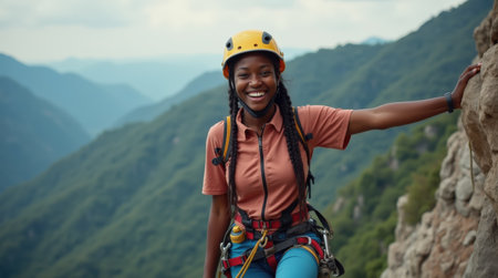 A young woman smiles while rock climbing in the mountains, showcasing her enthusiasm. She wears safety gear and stands near a cliff with stunning views of green hills