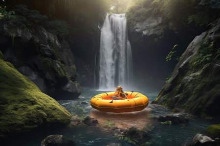 inflatable raft capsizing near a waterfall, created with generative ai