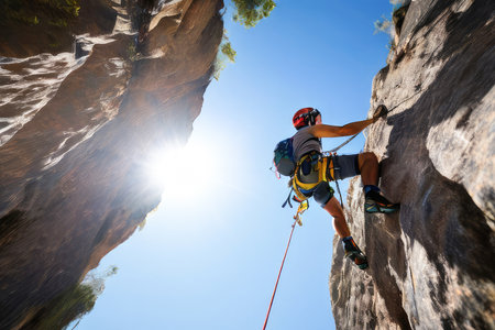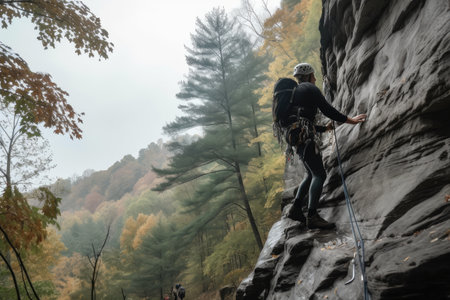 rock climber scaling vertical wall with backpack and ropes visible, created with generative ai