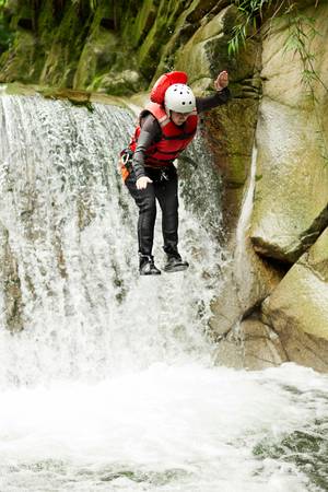 Young man rappelling abseiling from vertical rock face cliff, adventure sport fun activity at Stuibenfaelle Stuiben waterfalls in Breitenwang Reutte Tyrol Austria alps Europe