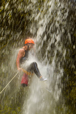 Man desceding a huge waterfall in Ecuadorian rain forest.