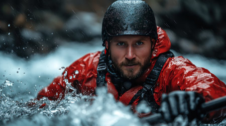 Close-up of a determined, bearded man in a red dry suit and helmet, wet from splashing water and rain, navigating turbulent river rapids with an intense gaze.