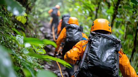 Three people hiking through dense forest wearing orange jackets and helmets