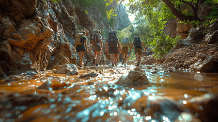 Group of hikers walking in the mountain river on a sunny day.