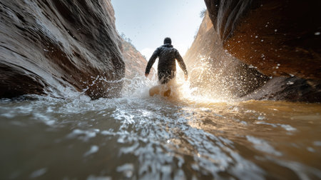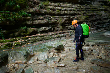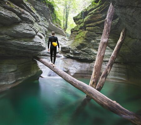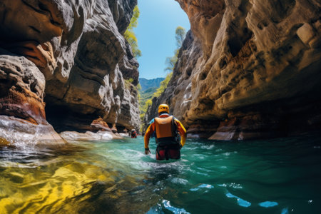 Canyoning extreme sport. canyoning expedition, popular trails, hard impressive spot. Man Exploring a wild untamed river canyon. Energy, freedom and adrenaline, back view. - generative AI