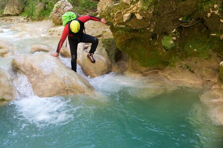 Canyoning extreme sport. canyoning expedition, popular trails, hard impressive spot. Man Exploring a wild untamed river canyon. Jump and guy in river with energy, freedom and adrenaline generative ai