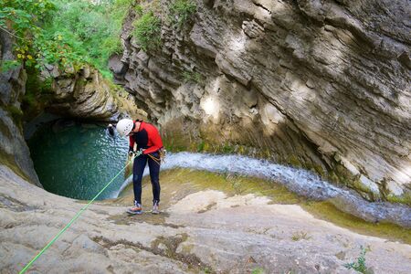Canyoneering Sorrosal Canyon in Pyrenees, Broto village, Huesca Province in Spain.