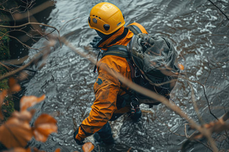 Rescue teams work tirelessly in heavy rain to save individuals from a raging river. The setting is a wild and remote area, with rushing waters creating dangerous conditions for those in need.
