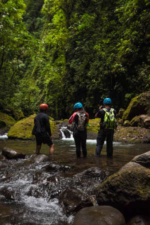 vertical shot walking along a riverbed surrounded by vegetation in the middle of the humid tropical jungle of Costa Rica