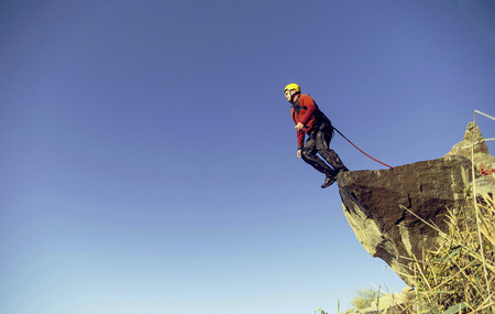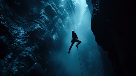rock climber hangs on a rope in a deep abyss.