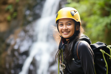 Adventurous Rock Climber with Yellow Helmet and Gear in Front of Waterfall AI Generative