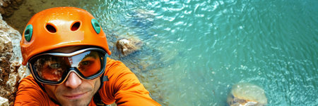 Climber Smiling For Selfie High Above River, Adventure And Courage In Extreme Sports