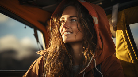 In searching of adventures Happy young man looking at camera and smiling while sitting at the front seat of his minivan : Generative AI