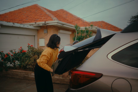 A Scandinavian woman with blonde hair sits in a car trunk, gazing at the horizon. She is dressed in minimalist casual attire, surrounded by cool forested mountains, creating a calm Nordic atmosphere.