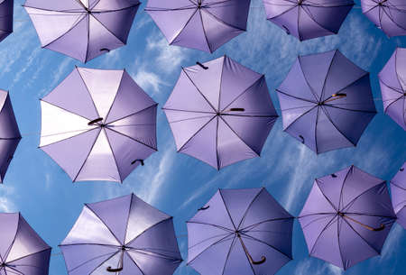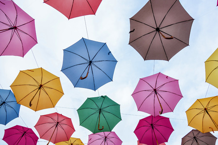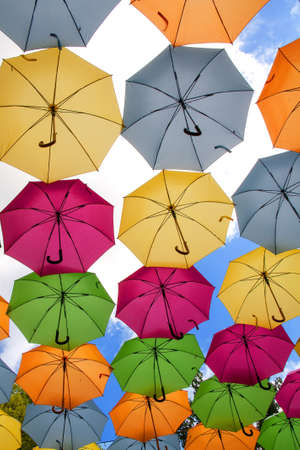 Colorful umbrellas in the sky. Multicolored umbrellas in the sky, creating a summer, art mood on the street