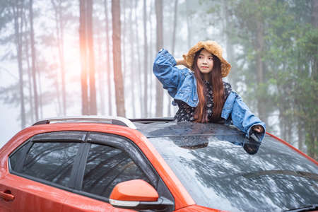 Relaxed happy young girl standing out of the sunroof with the pine forest on background in winter