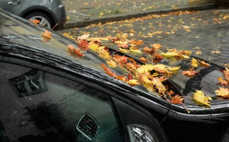 Car hood and glass with yellow leaves in the background. the windshield of the car is covered with fallen autumn leaves. autumn season.