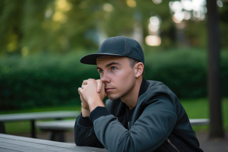 Thoughtful portrait of a young man with a baseball cap and a bomber jacket, sitting on a bench in a park