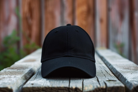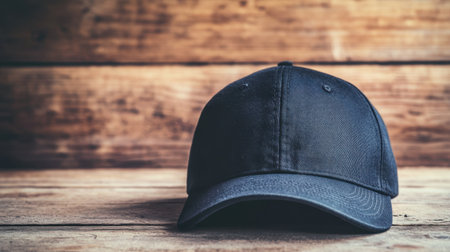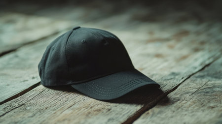 A black cap placed on a rustic wooden surface, suitable for fashion, casual wear, or branding. This minimalistic design adds a trendy touch to any setting.