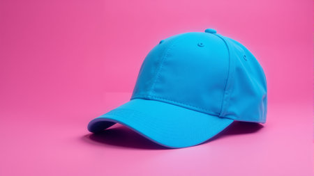 A striking blue cap sits elegantly on a vivid pink backdrop, creating a bold contrast. The smooth texture of the cap invites attention, evoking a sense of casual style and fun.