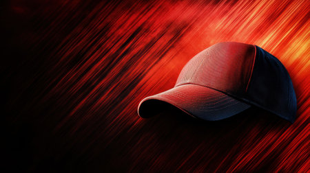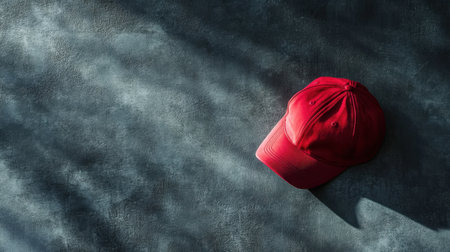 A striking red baseball cap positioned on a textured surface, illuminated by dramatic lighting that creates captivating shadows and highlights.
