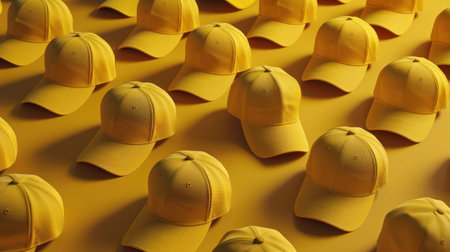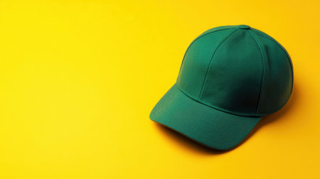 A single green baseball cap rests on a bright yellow surface, highlighting a striking color contrast. Ideal for fashion, marketing, and promotional content.