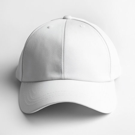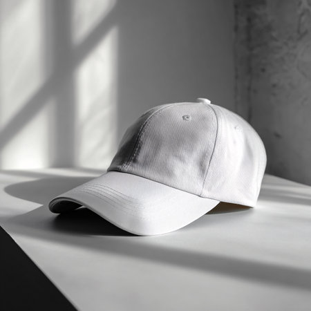 A classic denim cap rests atop a softly draped white fabric, showcasing a blend of textures and colors. This image evokes casual style and modern fashion.