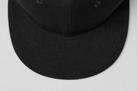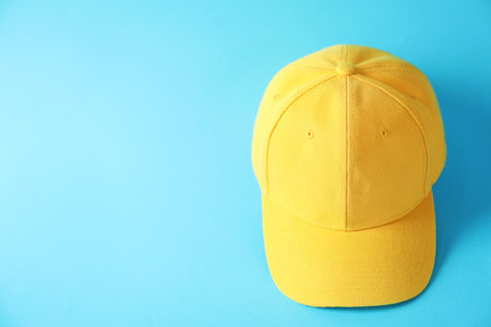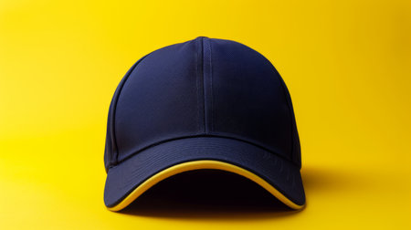 Black baseball cap on yellow background, isolated accessory. Fashion and sportswear concept