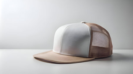 A clean and crisp white trucker hat with a tan mesh back and brim. This image is perfect for showcasing your brand or design.