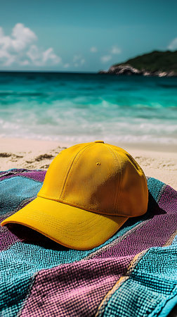Yellow cap and beach towel on the sandy beach, Seychelles