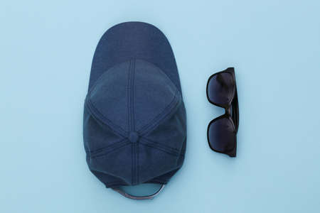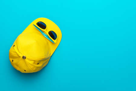 Top view photo of yellow baseball cap and sunglasses as summer concept.