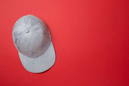 Top view of baseball cap over torquoise blue background. Flat lay top-down composition of white snapback cap. Minimalist flat lay photo of white cap with copy space.