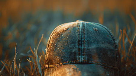 Jeans cap on the grass in the field at sunset. Selective focus.