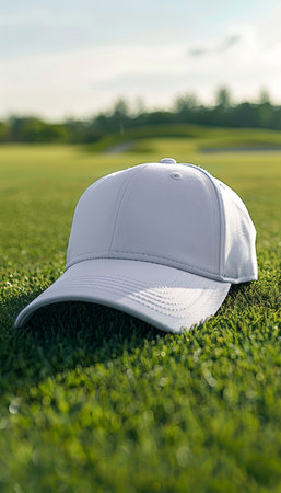 Close-up of a white golf cap resting on lush green grass with a blurred golf course in the background, under a partly cloudy sky.