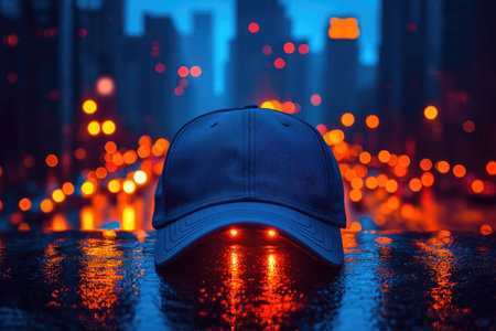 Blue Baseball Cap with Lights Reflecting on Wet Surface