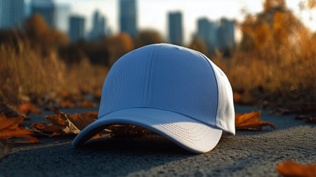 A blue cap lies on an urban path, framed by vibrant autumn leaves, with a city skyline in the background under a warm afternoon light.