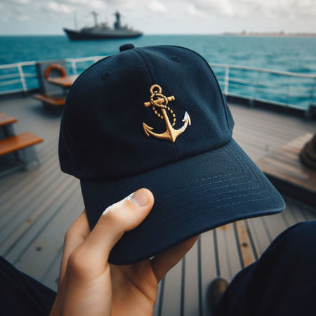 Close-up image of a sailor's cap with an anchor on the background of the sea.