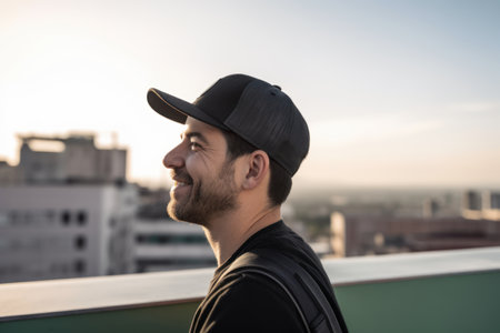Young handsome man in baseball cap and black t-shirt posing in an urban context