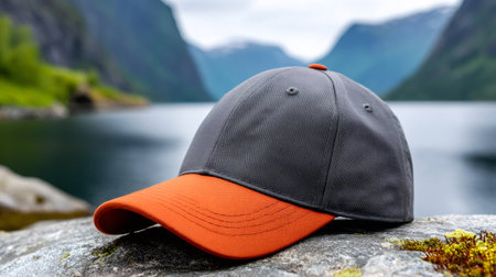 Baseball cap resting outdoors on a mossy rock with a tranquil fjord backdrop