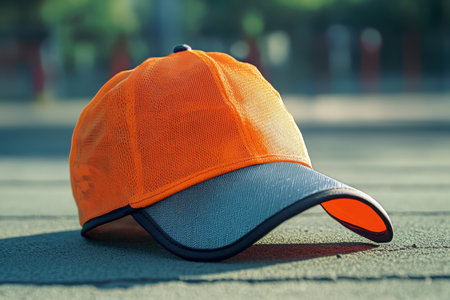 A bright orange cap sits on a paved surface under warm sunlight, showing its vibrant color and design.