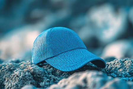 A stylish blue cap resting on a rocky surface in a natural outdoor setting during daytime