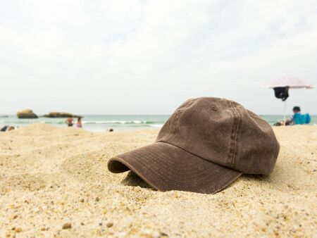 A casual white cap lies on a blue and white striped towel spread out on warm sandy beach. The sun shines brightly, creating a relaxed summer atmosphere.