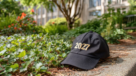 A stylish black cap with the year 2027 embroidered in gold lies gracefully on a lush patch of greenery, capturing a celebratory moment.