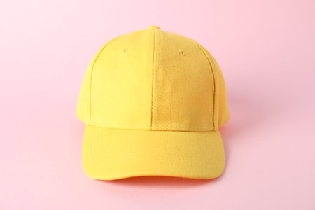 One yellow baseball cap on pink background, closeup. Mockup for design
