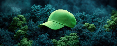 A vibrant forest scene highlights a striking green hat with fluorescent accents, ideal for modern activewear This nature-inspired image, showcasing a stylish hat amidst lush greenery, is perfect for fashion and outdoor enthusiasts It embodies the fusion of nature and active living, making it visually stunning and suitable for outdoor, AI Generative