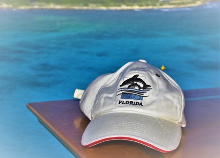 White Florida baseball hat with two jumping dolphin depictions is photographed with turqouise water in background