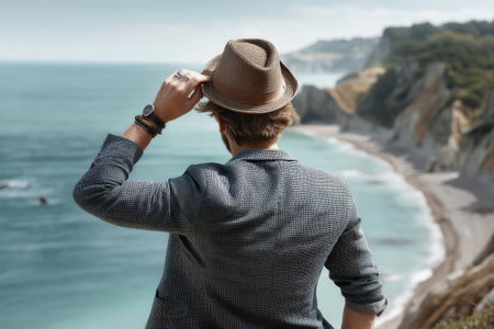Young caucasian male overlooking coastal cliffs in stylish attire.